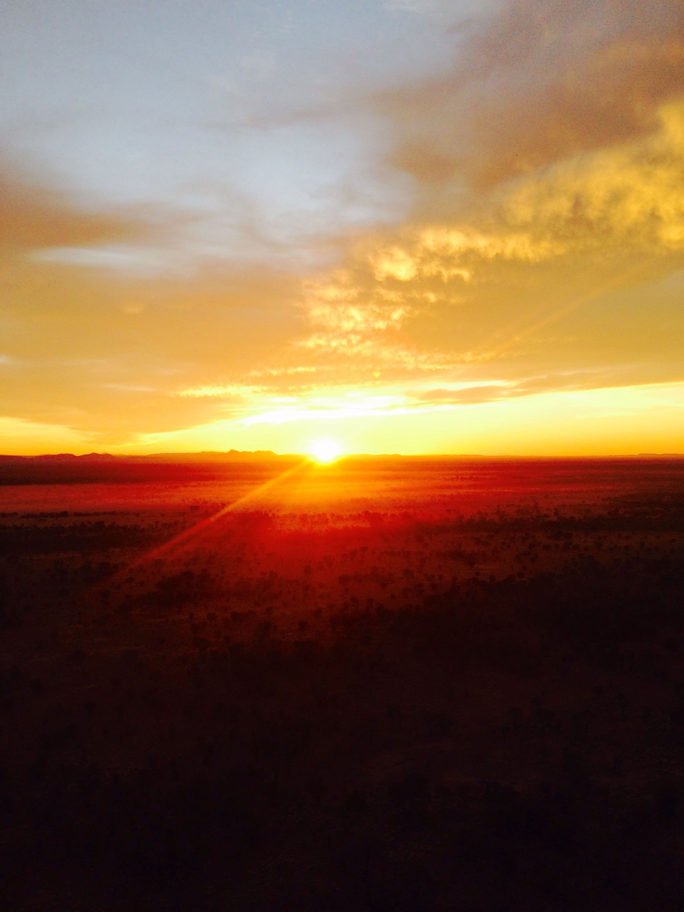 Anyway, all of that aside, I can honestly say that it is one of the best experiences I have had in my life. It was completely incredible. We could see for miles and miles across the desert and as the sun came up over the Macdonnell range it lit up the mist over the outback with this amazing morning glow. Combine this with kangaroos hopping below us (really!) and the spectacular clouds above us as the sun came up and it was just perfect.