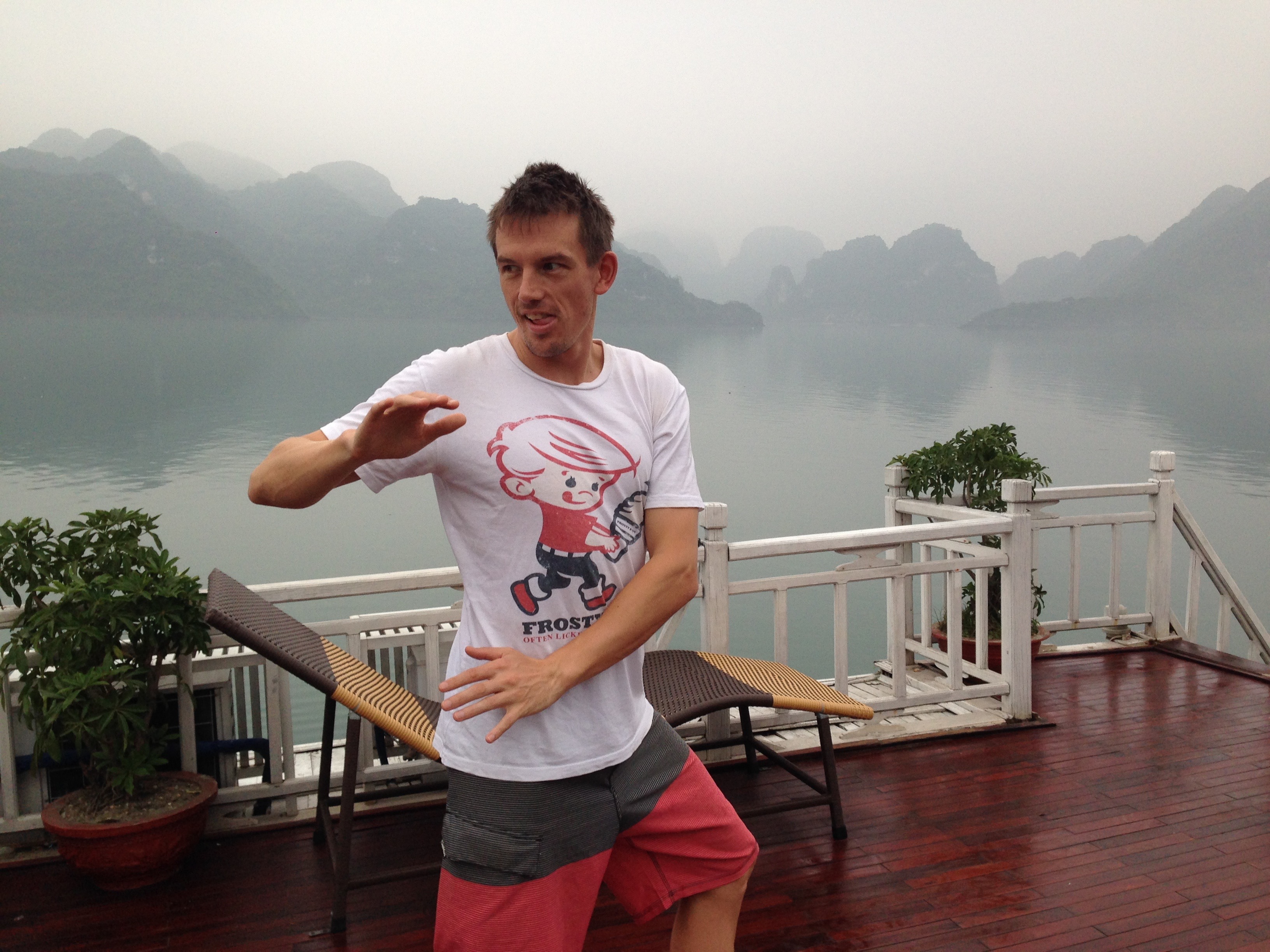 The following morning we did Tai Chi on the top deck of the boat, about 10 minutes in Ben realised that it was identical to the rugby warm up his Dad used to do when coaching them! “Roll the ankles, swing the arms…”