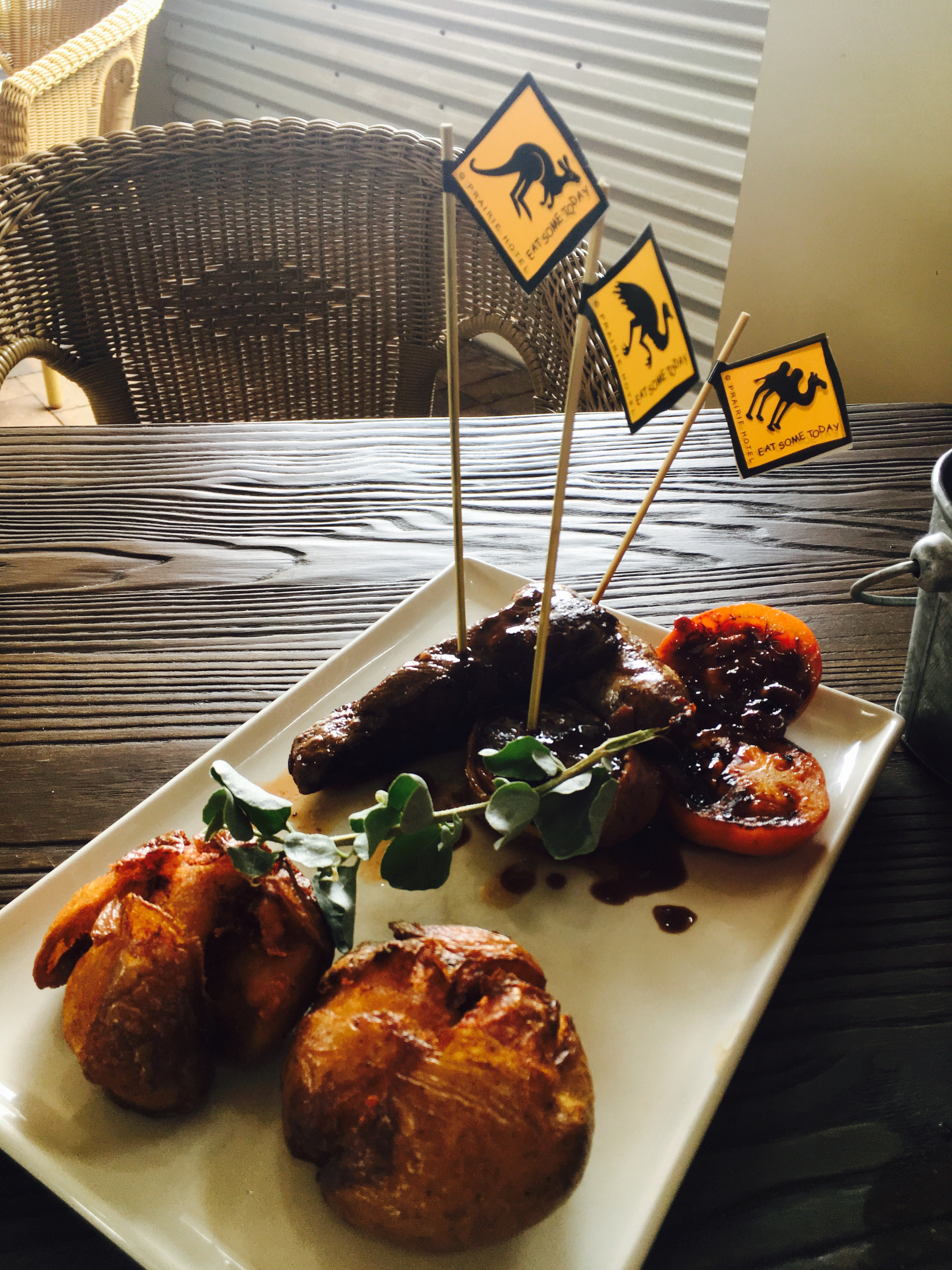 The ‘Feral Feast’ served at the Prarie hotel came recommended by Russell and Lisa, two friends of ours who have explored more of Australia than most people I know. We were presented with a platter of Kangaroo Steak, Camel Sausage, and Emu…well, emu burger perhaps?
