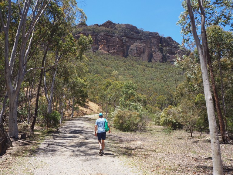 After brekkie and a bath we set off on the day’s adventures. Ben had told me not to over plan activities for the weekend so that he could organise some things, so I left him to it. True to his word he’d created an online map with pins for all the nearby walks and activities. We had a brief look at map when at the tent and decided on the Glowworm Tunnel Walk up the old train line out of Newnes. We got about 5 minutes drive down the road and he asked me to check the directions to start of the walk but neither of us had any signal. I decided to try to restart my phone as sometimes that triggers it, but alas it had a tantrum (probably too hot!) and began an endless restart cycle. Shortly after I almost followed suit and had a tantrum too (“perhaps we should have checked directions BEFORE leaving“…) but I maintained some semblance of composure and we eventually found the Wolgan Valley Way.